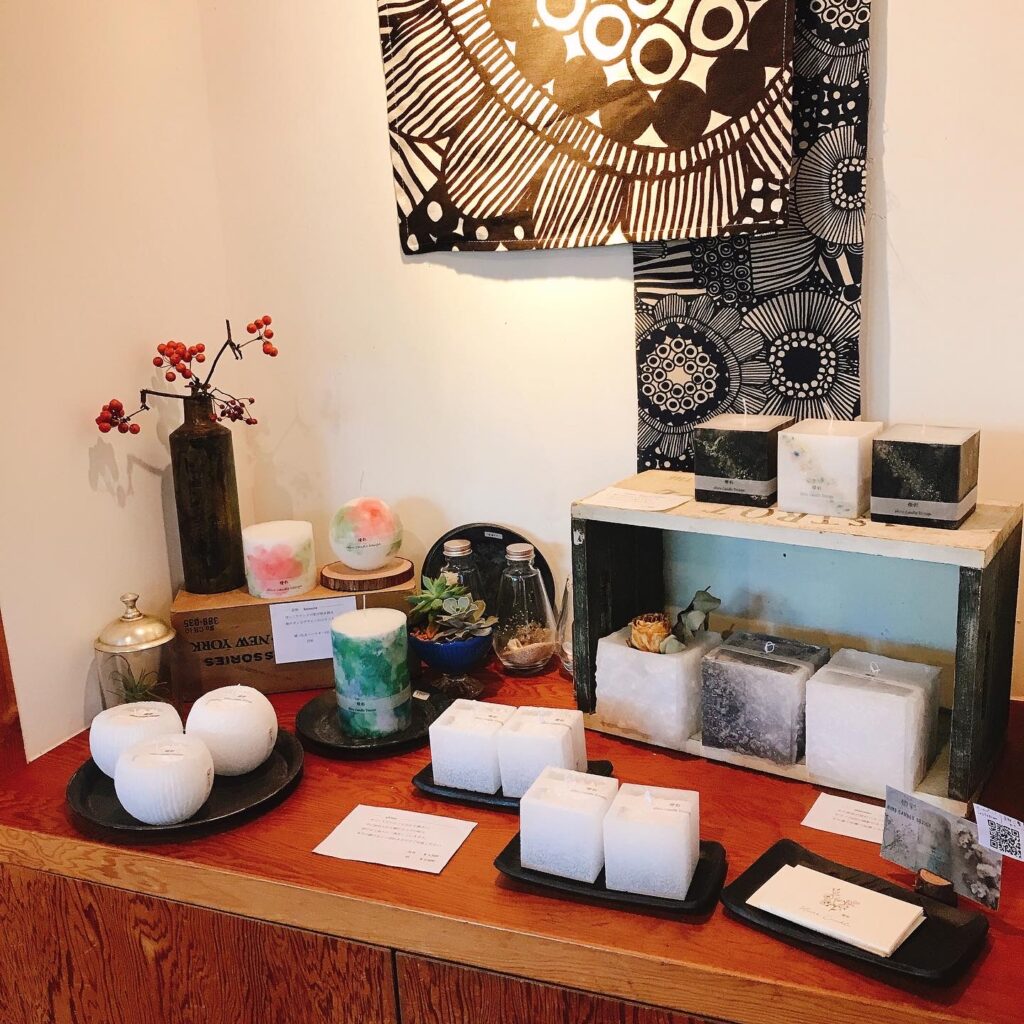【燈彩】の竹内のキャンドル(今回はお店の雰囲気に合わせて和テイストの作品を並べました)