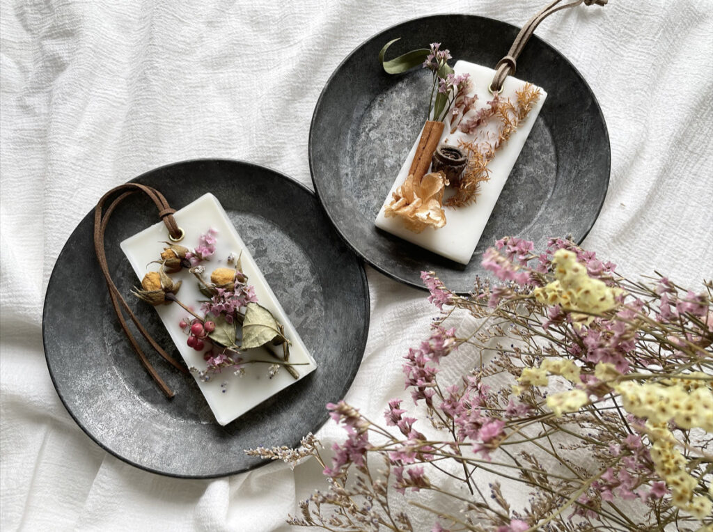 大豆ワックスと蜜蝋をブレンドしたものに、お好きな精油で香り付けしてお花を飾ります。